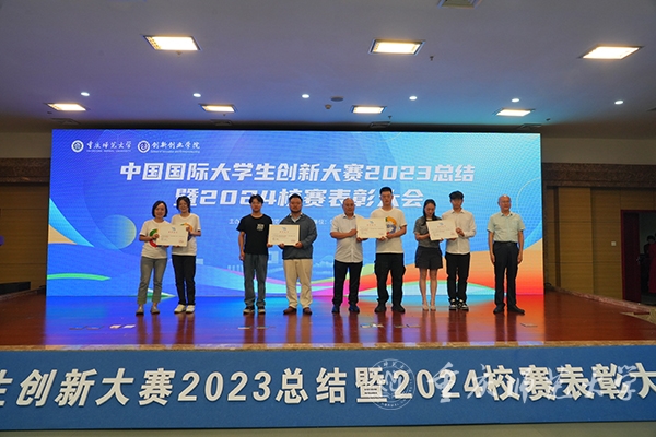 颁奖仪式环节,付文升为中国国际大学生创新大赛(2024)校赛金、银、铜奖获奖团队颁发了荣誉证书,杨如安为中国国际大学生创新大赛(2023)市赛获奖团队颁发荣誉证书,王国胤为中国国际大学生创新大赛(2023)国赛获奖团队颁发了荣誉证书。