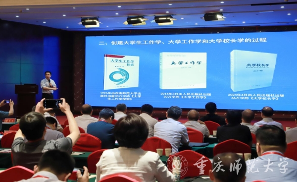 开幕式上,孟东方作题为《构建大学校长学》的主题报告,介绍了他“影响有影响的人影响有希望的人”的教育理念,分享了他研究“大学三学”的探索与实践历程:1996年在西南师范大学出版社出版《大学生工作学探索》、2016年在人民出版社出版《大学工作学》、2024年在人民出版社出版《大学校长学》。