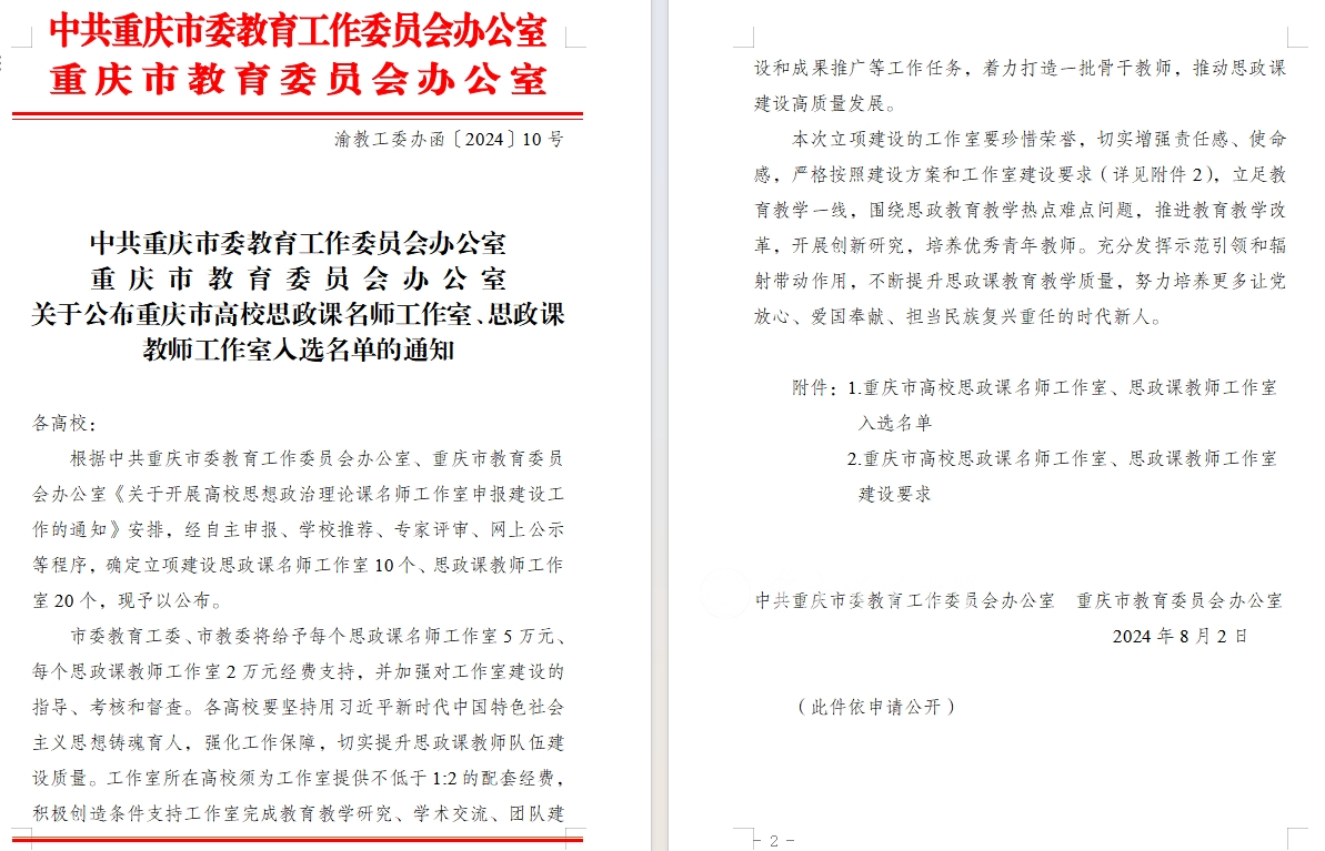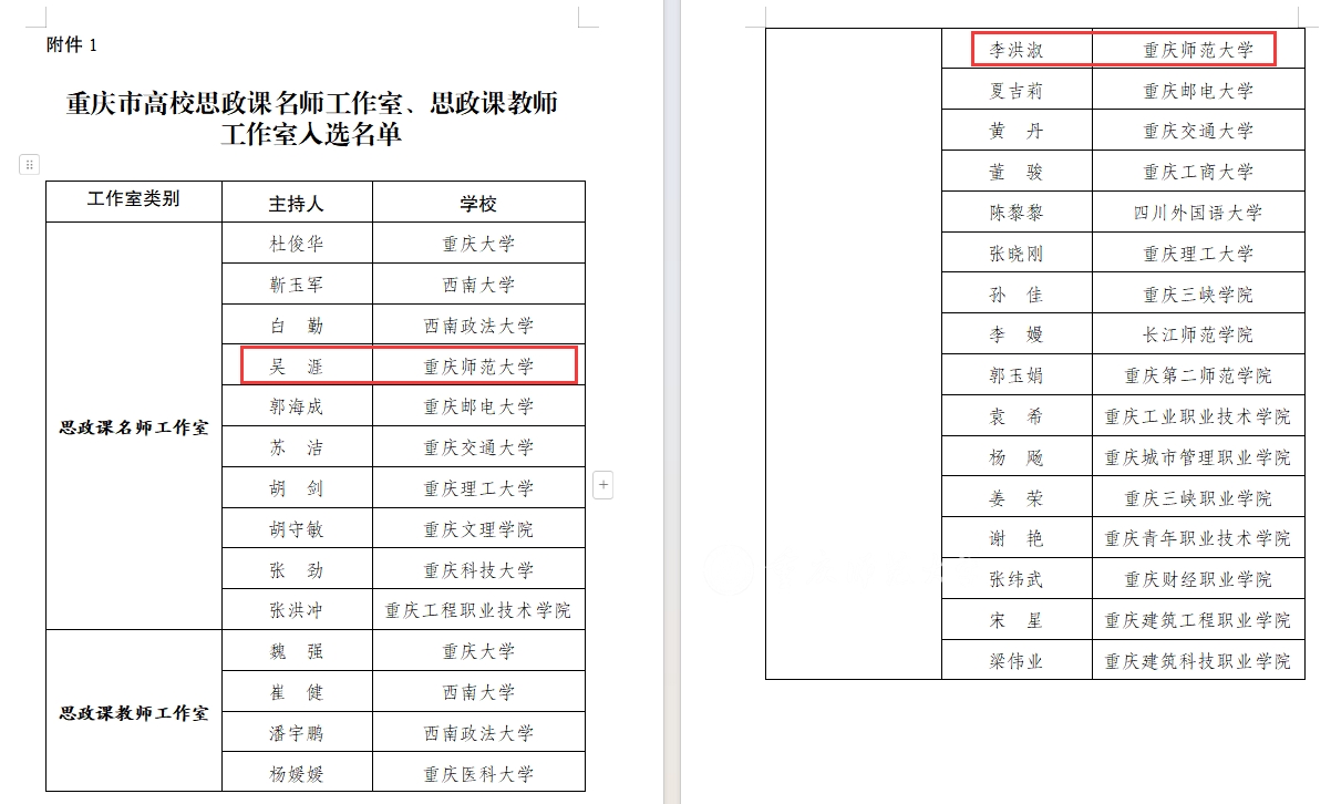 近日,重庆市委教育工作委员会公布重庆市高校思政课名师工作室、思政课教师工作室入选名单,beat365官网马克思主义学院吴涯教授、李洪淑副教授分别入选思政课名师工作室和思政课教师工作室。