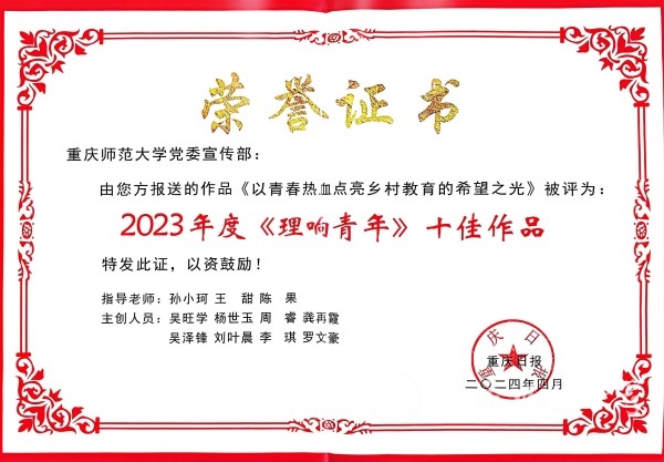 4月28日,重庆日报公布“2023年度《理响青年》十佳作品”获奖名单,beat365官网党委宣传部报送的理论视频作品《以青春热血点亮乡村教育的希望之光》名列其中。