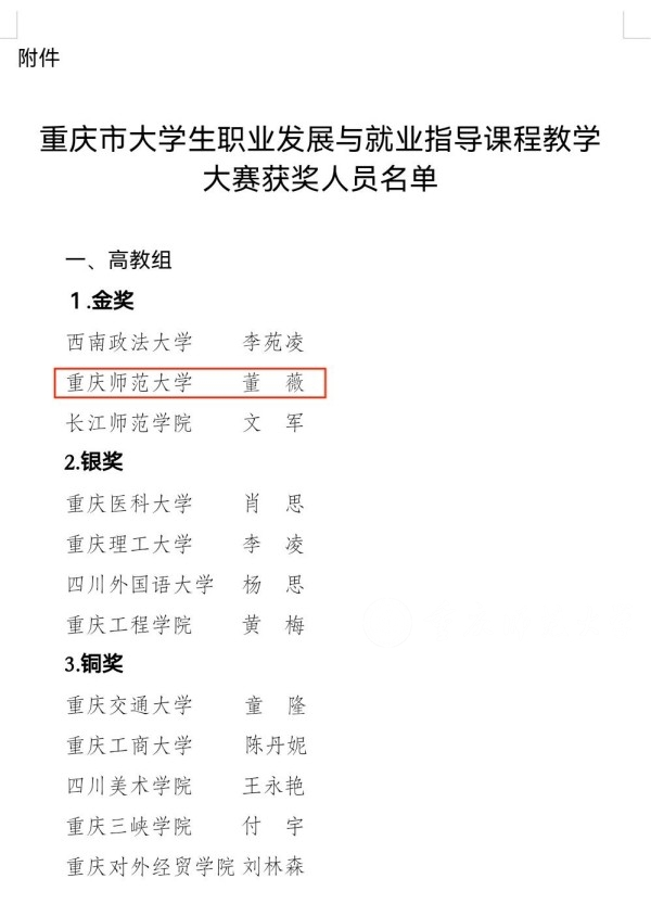 近日,重庆市教育委员会公布《重庆市教育委员会关于全市大学生职业发展与就业指导课程教学大赛获奖情况的通报》,beat365官网学生生涯发展中心董薇老师荣获大赛金奖,并被市教委推荐参加全国总决赛。