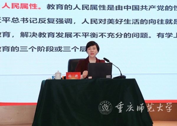 在宣讲全市教育大会精神时,张艳结合重庆市委书记袁家军在全市科技创新和人才工作大会以及重庆市教育大会上的讲话精神,阐述了教育强市的五大战略定位、分2027年和2035年二步走实现六个显著提升的发展目标、六项重点任务以及当前重庆市教育发展面临的新形势,引领教师们树立新的现代教育观。