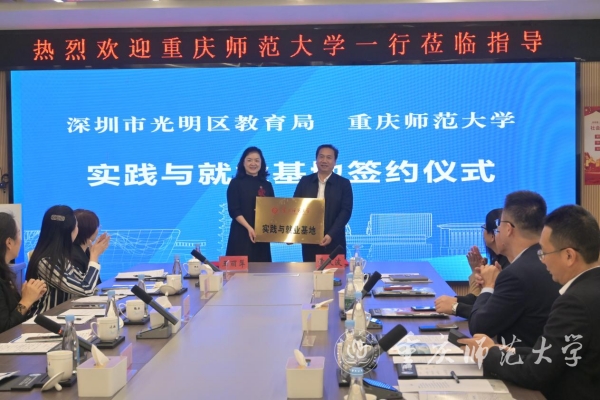 会上,黄汉波介绍了光明区、光明教育、教师队伍培养及重师毕业生招聘基本情况。学校招生就业处相关负责人介绍了学校招生和就业工作情况。通过深入交流,双方达成共识,学校与深圳市光明区教育局签订《实践与就业基地合作协议》并授牌。