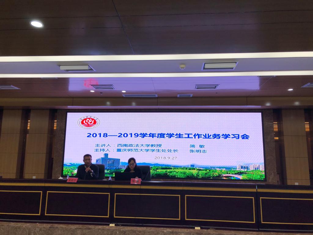 9月27日下午,beat365官网学生工作业务学习会在博雅楼503举行,第九届全国辅导员年度人物、西南政法大学教授简敏受邀主讲“新时代高校辅导员的‘知’与‘行’”。学院分管学生工作副书记、学工办主任、辅导员、班主任和学生处全体干部等110人参加。此次讲座由学生处处长张明志主持。