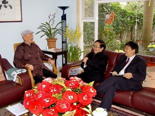| 2005年2月12日,时任党委书记傅世放、现任校长周泽扬前往邓垦家中拜望 |