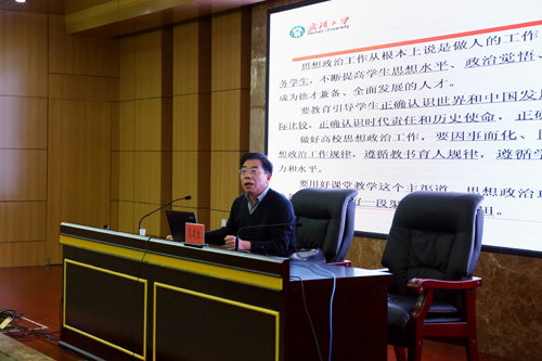 熊建生教授以习近平总书记在全国高校思想政治工作会议上的讲话作为专题报告的导语,围绕大学生思想政治教育的价值意蕴、时代特色、创新发展等三个方面,以大学生思想政治教育的十大核心概念为切入点,分析了大学生思想政治教育的本质属性;结合当代中国社会的变革、当代大学生的新特点及武汉大学学生工作的创新实践介绍了大学生思想政治教育的时代特色;最后从找准定位、突出地位、确保到位、提升品位四个角度深入阐述了大学生思想政治教育的创新发展。