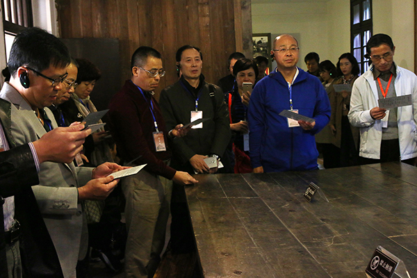 随后,与会代表来到了八路军驻重庆办事处旧址。在周恩来同志的办公室,大家目不转睛地阅读办公桌上他亲笔所写的《我的修养要则》及皖南事变后在《新华日报》上的题词,学习周恩来同志的自我批评精神。“江山如此多娇,引无数英雄竞折腰。惜秦皇汉武,略输风采;唐宗宋祖,稍逊风骚。一代天骄,成吉思汗,只识弯弓射大雕。俱往矣,数风流人物,还看今朝!”从救亡室中传来了大家铿锵有力的朗朗读书声。大家了解到,毛泽东同志所作的《沁园春•雪》便是在这救亡室中赠与友人,并得以发表的。