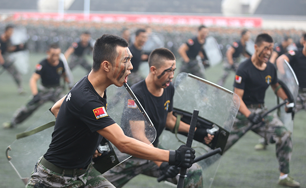 军训汇报表演上,39个连队踏着整齐的步伐,喊着响亮的口号,依次通过主席台接受检阅。由2015级女生组成的“军中绿花”——女子擒敌拳方队,率先进行表演。她们巾帼不让须眉,展示出“女兵”的飒爽英姿。由2015级男生组成的防爆小分队,在演习中,进行了楔字形、H形、U形的队形变换,展示出男儿的血性。汇演最后,表演方队和着高昂的乐声,从不同方向有序汇集,摆出“中国梦”、“CQNU”、“八一”与“70”等字样,并用手语演绎歌曲《国家》。他们精彩的表演赢得了观众的热烈掌声。