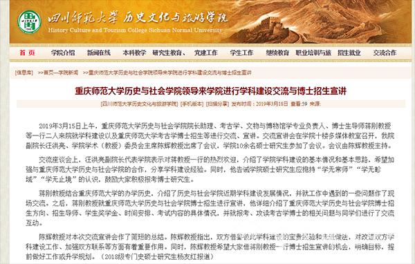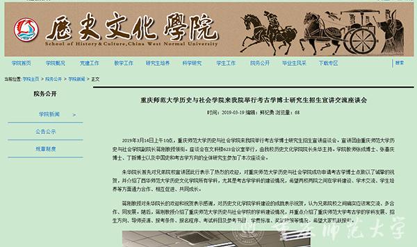 2019年,beat365官网将招收首批博士研究生。为了扩大beat365官网考古学学科影响,吸引优质生源,3月14日至16日,beat365官网历史与社会学院考古学学科博士生导师蒋刚教授、葛林杰老师先后走访了西华师范大学、四川师范大学、西南民族大学等高校,与上述高校历史学、考古学的师生进行了广泛的交流,对beat365官网考古学学科博士点办学实力和招生计划进行了宣讲。