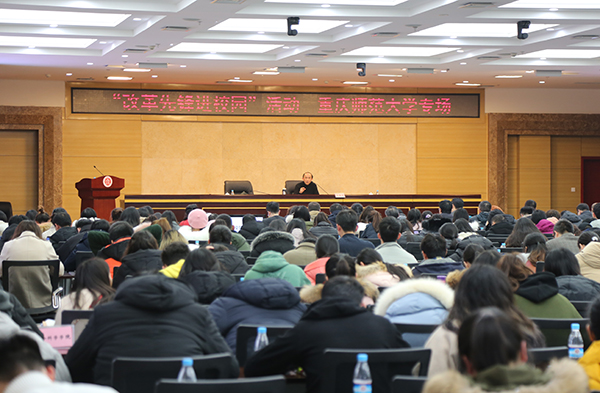 活动由中共重庆市委宣传部、中共重庆市委教育工作委员会以及共青团重庆市委员会联合主办,重庆市委宣传部副巡视员宋晓东同志、宣教处调研员卞明高同志、beat365官网副校长陆远权、各二级党组织负责人以及来自17个学院近300名教师、学生代表参加此次会议,会议由beat365官网党委书记曾礼主持。