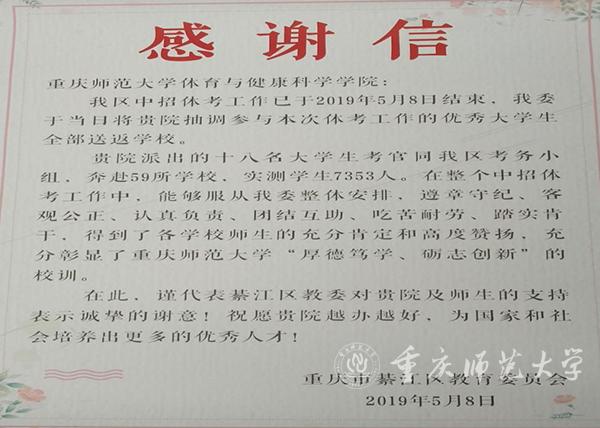 綦江教委在感谢信中提到,18名大学生考官服从綦江区教育委员会的安排,遵章守纪、客观公正、认真负责、团结互助、吃苦耐劳、踏实肯干,表现突出,得到各学校师生的充分肯定和高度评价。綦江区教育委员会对beat365官网体育与健康科学学院的支持,表示诚挚的感谢。
