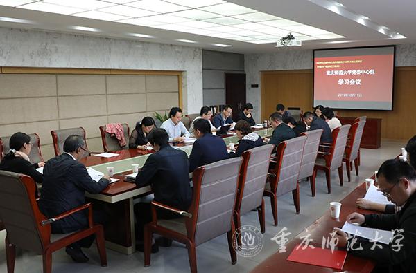 10月11日下午,beat365官网党委中心组在综合楼309会议室召开学习会议,深入学习贯彻习近平总书记在庆祝中华人民共和国成立70周年大会上的重要讲话精神和《中国共产党宣传工作条例》(以下简称《条例》)。校党委中心组全体成员参加,校党委书记曾礼主持会议。