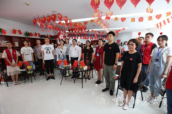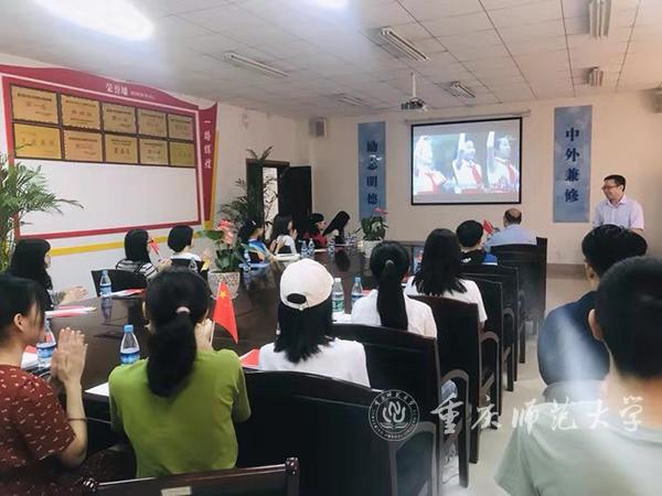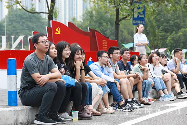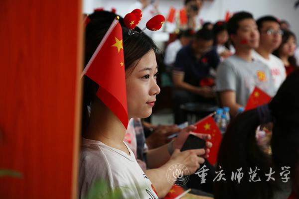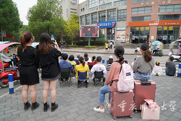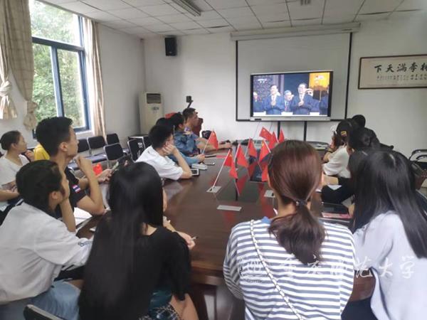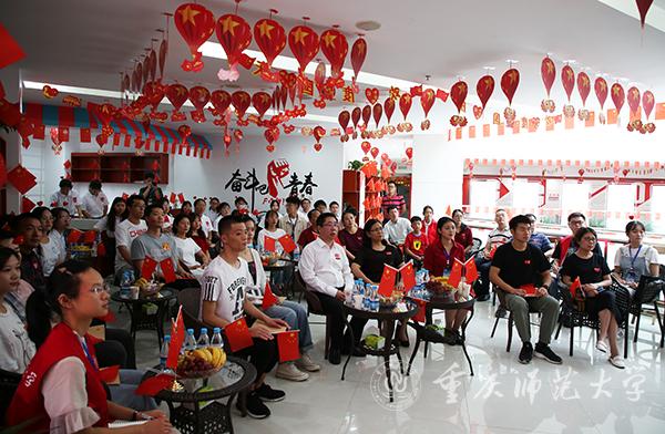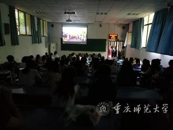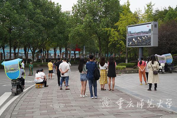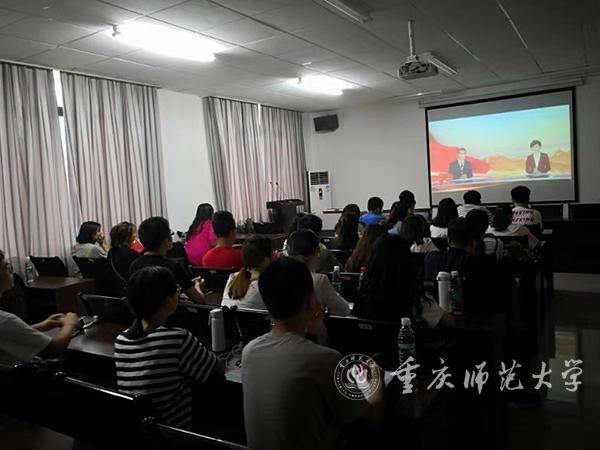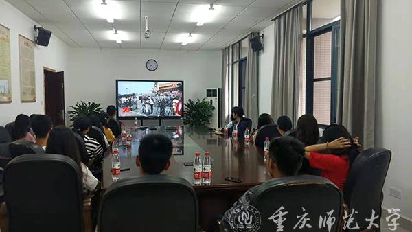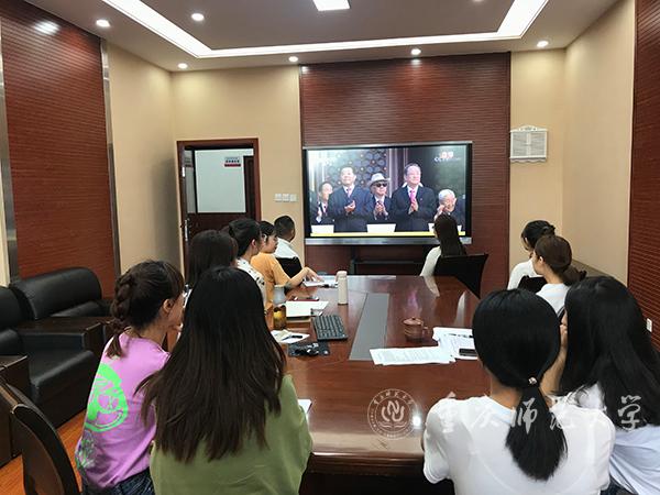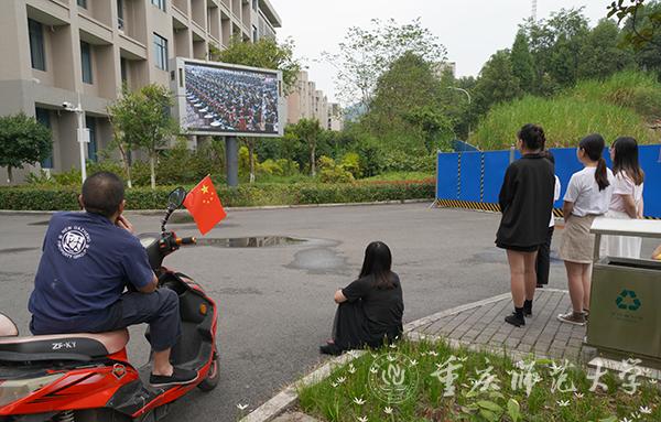 校党委副书记、校长孟东方,党委副书记龚燕与师生代表在“青马”工程全国研究培训基地收看实况直播;重师师生分散在校内LED户外大屏处,观看庆祝中华人民共和国成立70周年大会;全校各二级基层党组织、各单位专门安排场地,利用网络、电视等媒体,组织本单位干部师生集中收看。
