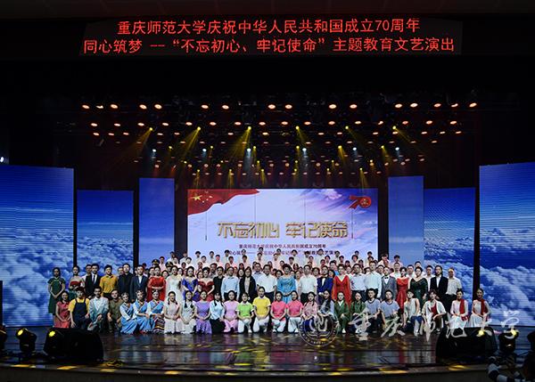 中国人民肩负着历史的使命,使命引领着担当,使命呼唤着未来。慷慨激昂的大合唱——《心中的使命》由师生员工自编自演,展现了重师人“自强不息,躬行师道”的使命与担当;歌舞《江山》撷取国庆大阅兵的灵感,让飒爽英姿的国旗班同学们展示出了人民军队的作风、纪律以及军容;“我站在三春湖畔向你报道……”“我站在图书馆向你报道……”在《我们在重庆师大报道》朗诵中,学校广播台的播音员们从幕后走到台前,为大家讲述了这些年来重师大取得的成就;“母亲啊中国,你让我永远铭刻”,伴随着饱含热爱与祝福的歌曲《致祖国》,本次主题文艺演出落下了帷幕。