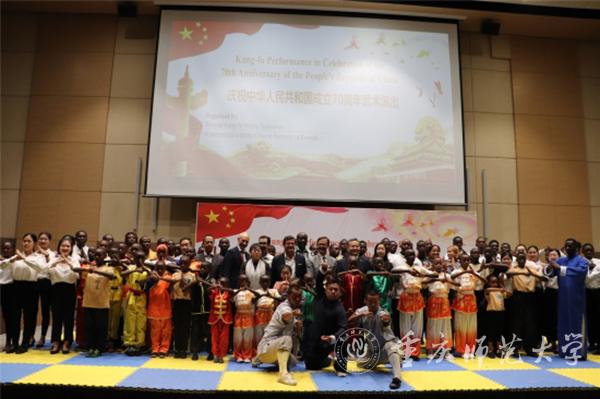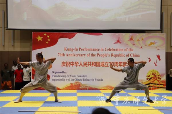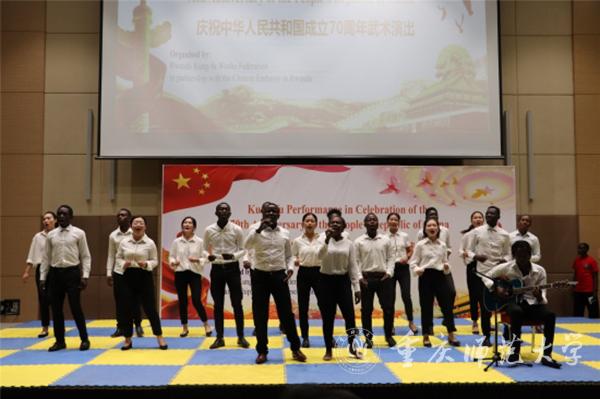 当地时间9月15日晚,庆祝中华人民共和国成立70周年武术汇演在卢旺达首都基加利国际会展中心举行。卢政府及社会各界、驻卢使节、中资机构和华侨华人代表、卢旺达大学教育学院孔子学院师生等500余人观看演出。
