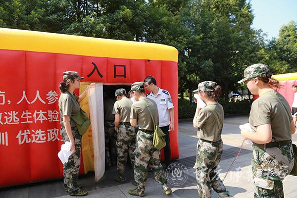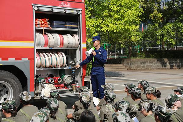 疏散演练结束后,全体新生按照连队依次参观消防装备车辆和体验疏散逃生屋。消防中队教官详细地向同学们讲解消防装备车的功能以及相关设备的使用方法和技巧,全体新生依次通过疏散逃生屋,在模拟环境中实际应用逃生技巧。此次灭火演练共使用干粉灭火器173具,消防装备车2辆,疏散逃生帐篷2顶,2019级全体新生参加。