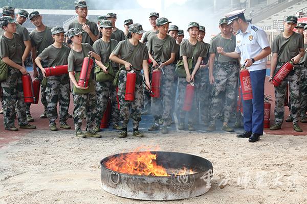 随后,消防中队官兵邀请学生代表现场学习正确使用灭火器等消防救援工具,并在消防官兵及学校保卫处老师的安全指导下,按照灭火的正确步骤和方法,亲自体验了现场灭火的过程,将燃起浓烟的大火成功迅速扑灭,新生在整个灭火过程沉着、冷静、迅速、有效。