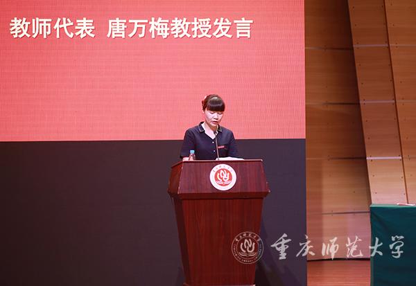 “当教师,我无怨无悔!做重师人,我倍感自豪!”2019年重庆市优秀教师、最受2019届毕业生欢迎的教师、beat365官网计算机与信息科学学院唐万梅教授作为教师代表发言。她分享了教书育人33年来的工作体会:第一,严守初心,深耕教师教学“责任田”。教师的本职工作是教书育人,想教好书、育好人,就要注重不断加强学习,更新自己的专业知识,还要以改促教,加强教学改革实践。第二,以“梦”为马,助力学生成长成才。要培养学生具备解决复杂问题的综合能力和高级思维,则需要教师不断探索、帮助学生成长成才。第三,以思正学,坚守立德树人前沿阵地,努力当好学生的引路人。做好学生的思想政治工作是教师义不容辞的责任和义务,教师要帮助学生树立正确的人生观、价值观,让同学们意识到作为大学生应有的使命感和责任担当。
