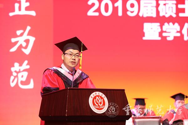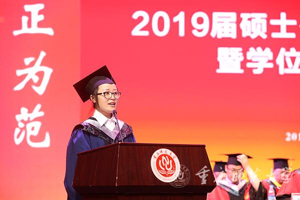 计算机与信息科学学院的胡慧丽同学代表2019届全体毕业生发言。她分享了在校三年间的学习生活时光。她感恩母校老师同学,表示在未来的人生旅途中,不会淡忘深厚的同窗友情,不会放弃曾经拥有的理想信念,不会辜负师长的殷切期望。