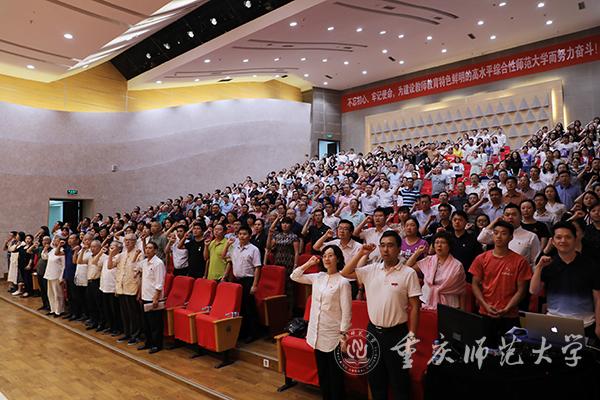 曾礼书记强调,学校新近召开的第三次党代会和本科教育大会,对今后五年的指导思想、奋斗目标和发展战略做出了系统设计,提出了“四大发展战略”和“九大重点任务”,制定了《加快建设高水平本科教育五年行动计划》等“1+4”内涵式发展行动计划。“蓝图已经绘就,任务已经明确,我们要进一步强化使命担当,发扬钉钉子精神,撸起袖子加油干”。各级党组织和全体党员要紧密团结在以习近平同志为核心的党中央周围,牢记为党育人、为国育才的使命,以自我革命精神持续加强党的建设,把习近平新时代中国特色社会主义思想落实在重师校园,为实现教师教育特色鲜明的高水平综合性师范大学的奋斗目标提供坚强的政治、思想和组织保障,为实现“两个一百年”奋斗目标和伟大“中国梦”作出新的更大贡献。