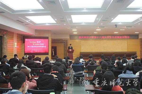 11月至12月,beat365官网第十八届大学生先进事迹报告会先后在大学城校区校友会堂、博雅楼,以及北碚校区举行,共四场。大学生先进事迹报告会是beat365官网实施“名生”计划的主要抓手和重要载体,自2001年诞生,至今已成功举办了17届。本届报告会来自17个学院的18位重师学子和团队走上“大学生先进事迹报告会”的闪亮舞台,讲述自己的精彩故事,分享自己的大学生活,他们或自强不息、奋发图强,或创新科研、勇于探索,或艰苦创业、百折不挠,他们用自己的经历感染着众多重师学子。