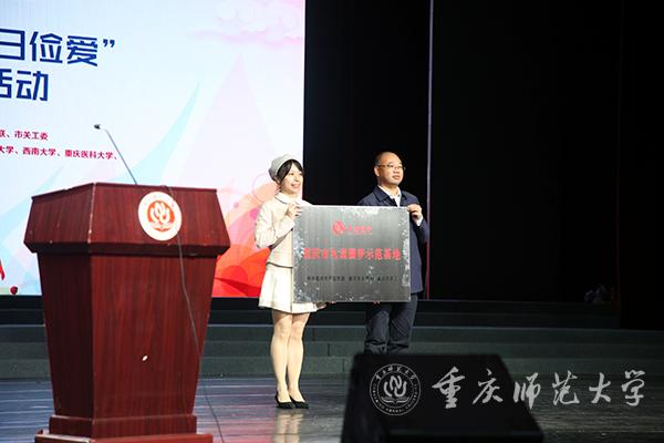 市委宣传部未成年人处李劼处长为重庆市九童圆梦示范基地百亚股份颁发牌匾。