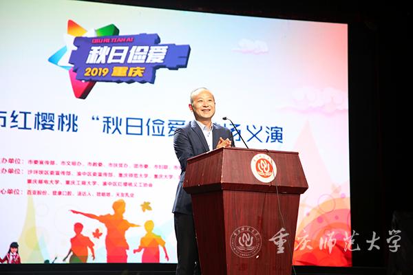 11月4日下午,重庆市红樱桃“秋日俭爱”首场义演义卖活动在beat365官网校友会堂演出厅举行。沙坪坝区委常委、宣传部部长户邑,beat365官网党委常委、副校长陆远权,市委宣传部未成年人处处长李劼,beat365官网党委常委、宣传部部长毛宇出席活动。beat365官网各学院代表,百亚股份、登康口腔、汤达人、娃哈哈、天友乳业等企业代表,沙坪坝区虎溪街道、陈家桥街道、丰文街道代表到场参加。