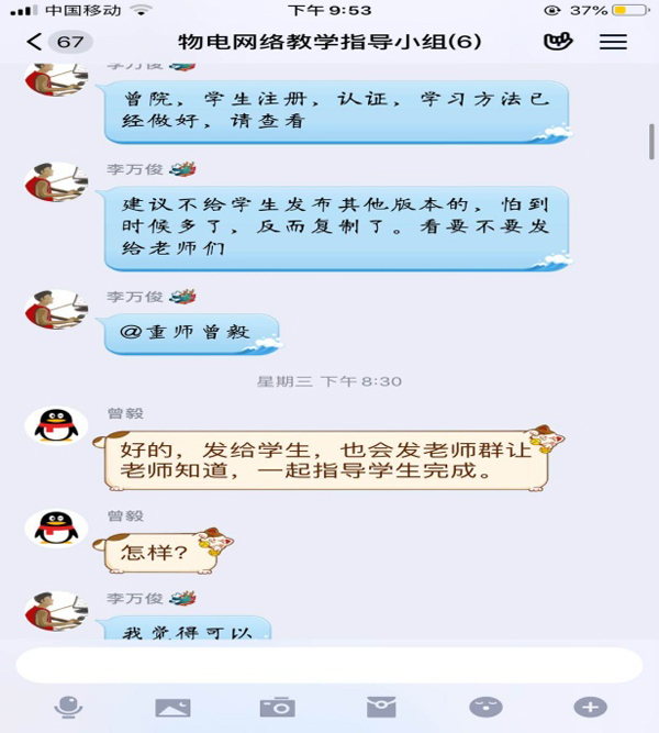 积极筹备、精准施策,开学前期准备充分。为确保延迟开学期间“停课不停教,停课不停学”,学院第一时间建立健全战“疫”期间教学工作机制,成立党政联席、教务联络等工作群,核定线上课程、审核教学方案、组织服务团队,全力护航春季学期教学工作。学院提前摸排了全院教师拟使用平台情况,组织成立网络教学指导小组,为教师提供网络教学指导和咨询;同时,支持老师根据网络教学需要购买数位板、耳麦等教学工具,为线上教学的开展做好准备;学院青年教师充分发挥在线上教学中的带头作用,其中,学院李万俊老师自2月9日起连续14天每天工作超过13个小时,牵头编写了“中国大学MOOC”平台教师版、学生版使用说明书供师生使用,为学院线上教学的顺利开展提供了强有力的保障。