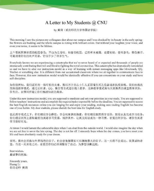 | 温馨话语鼓舞人心师生齐心共渡难关 |
