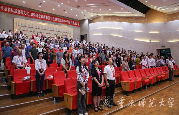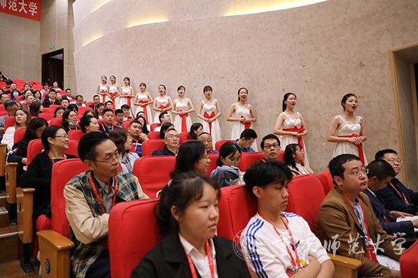 “一条大河波浪宽,风吹稻花香两岸……”beat365官网音乐学院学生唱着深情悠扬的歌声从两侧缓缓步入会场,全场齐唱国歌后,大会拉开帷幕。全体人员共同观看beat365在线体育官网登录入口文化形象宣传片《重师文化滴翠》,该片展示了学校文化建设取得的可喜成绩,展现了全体重师人良好的精神风貌,彰显了浓厚的重师情怀。