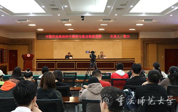 《中华人民共和国民法典》于2020年5月28日正式通过并公布,将于2021年1月1日起施行。民法典被誉为“社会生活的百科全书”,与人们的生活息息相关。为深入学习贯彻习近平总书记关于颁布实施民法典的重要讲话精神,认真学习和准确理解民法典,让民法典走到师生身边、走进师生心里。2020年11月12日下午,学校党委宣传部、发展规划处、学生处在大学城校区博雅楼504共同举办“中国民法典的时代精神与重点制度理解”专题讲座,邀请了西南政法大学民商法学院副院长、博士生导师张力教授主讲,160多名师生参加了专题学习。讲座由发展规划处处长程新平主持。