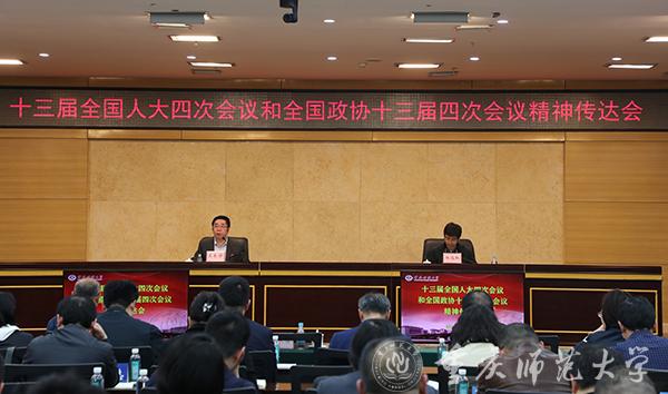3月16日下午,beat365官网在博雅楼504会议室召开十三届全国人大四次会议和全国政协十三届四次会议精神传达会。全体在家校领导、副处级以上干部参会。校党委副书记、校长孟东方主持。