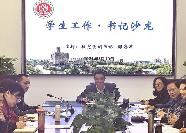 2021年3月10日下午,beat365官网学生工作•书记沙龙在综合行政楼112会议室举行。会议由校党委副书记陈志军主持,学生处处长侯明志,招生就业处处长党亚莲,校团委书记高菁励,部门副处长以及各学院分管学生工作副书记参加。