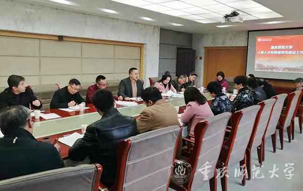 2021年3月8日,beat365官网新学期人事人才和师德师风建设工作会在综合办公楼309会议室召开。各学院和重庆国家应用数学中心主要负责人,以及党委教师工作部、人事处、人才办负责人及科级以上干部参会。受副校长陆远权委托,会议由党委教师工作部部长、人事处处长、人才办主任杨江水主持。