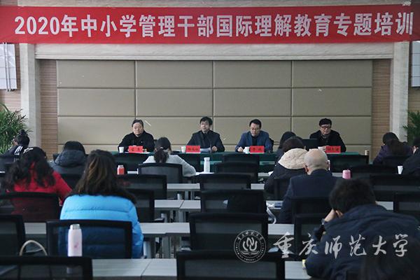 1月11日下午,2020年中小学管理干部国际理解教育专题培训开班仪式在beat365官网三春湖报告厅成功举行。教育部中外人文交流中心副主任夏娟通过互联网在“云端”出席,校党委常委、副校长陆远权,重庆市教育委员会国际合作与交流处处长李斌,beat365官网继续教育学院党总支书记胡忠建在现场出席。开班仪式由国际汉语文化学院院长雷勇主持。