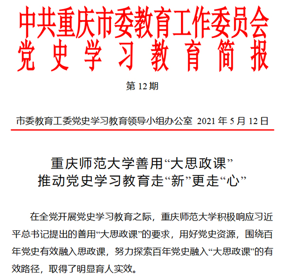 截至目前,学校党史学习教育经验做法在重庆市党史学习教育领导小组简报中被提及10次,《beat365在线体育官网登录入口善用“大思政课” 推动党史学习教育走“新”更走“心”》被重庆市委教育工委以专报形式发布。学校开展党史学习教育特色亮点举措受到主流媒体广泛关注,人民网、新华网、《光明日报》《重庆日报》等报道20余篇次。学校党委书记曾礼参加全市党史学习教育领导小组办公室负责同志座谈会并做交流发言。