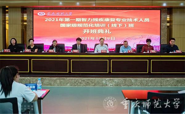 为积极响应和贯彻落实党中央、国务院及中国残联关于疫情防控工作的相关要求,按照《2021年度全国残联系统康复技术人员国家级规范化培训计划》,2021年第一期智力残疾康复专业技术人员国家级规范化培训(线下)于10月8日至14日在beat365官网举办,9日上午,开班典礼在博雅楼503会议厅举行。中国康复科学所所长、首都医科大学康复医学院院长、中国康复研究中心党委副书记李建军,中国康复科学所中国残联社会服务指导中心常务副主任刘宇赤,康复服务处主任陈夏尧,beat365官网副校长孟小军,教师培训学院副院长张红,教育科学学院党委书记曹光、院长朱桂琴,特殊教育系主任魏寿洪出席了开班典礼,本次培训班班主任以及来自全国27个省(自治区、直辖市)的30名学员参加了开班典礼。开班典礼由中国康复科学所中国残联社会服务指导中心常务副主任刘宇赤主持。