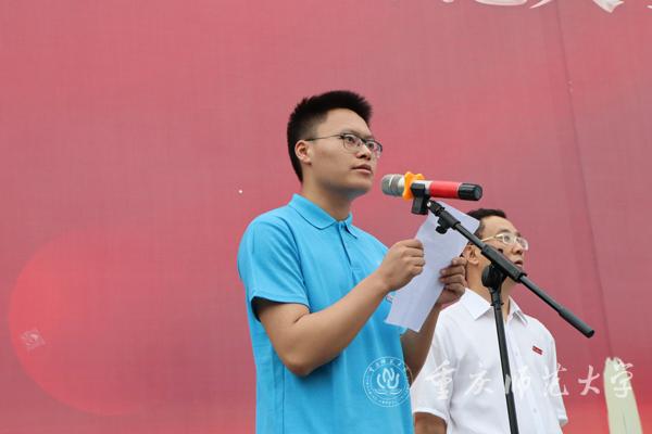 学生代表地理与旅游学院2019 级旅游管理专业徐曹棋同学表示要坚持“安全第一”的原则,保持“重师印记”的文化特质,传递“敢于吃苦、甘于奉献”的精神,做好本次三下乡实践活动。