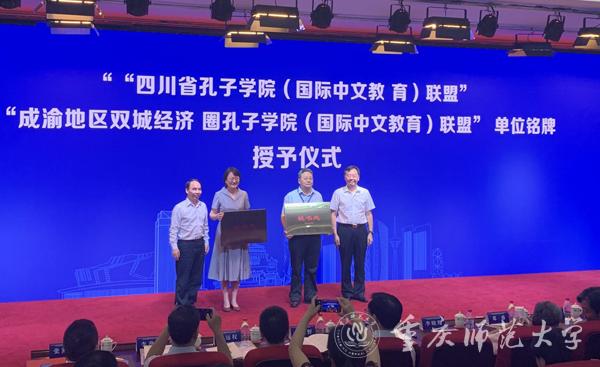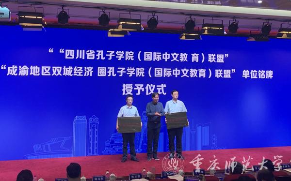 陆远权副校长出席了“成渝地区双城经济圈孔子学院(国际中文教育)联盟”揭牌仪式并作为理事长单位代表上台接牌,雷勇院长作为秘书处单位代表上台接牌。