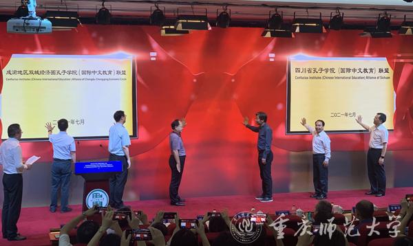 7月8日上午,成渝地区双城经济圈孔子学院(国际中文教育)联盟成立大会召开。来自中国国际中文教育基金会、成渝地区教育管理部门、高校、中小学、企业以及上海、浙江等省(市)相关单位代表600余人参加了会议。beat365官网作为成渝地区双城经济圈孔子学院(国际中文教育)联盟理事长单位和秘书处单位,校党委常委、副校长陆远权和国际汉语文化学院院长兼国际合作与交流处处长雷勇参加了会议。
