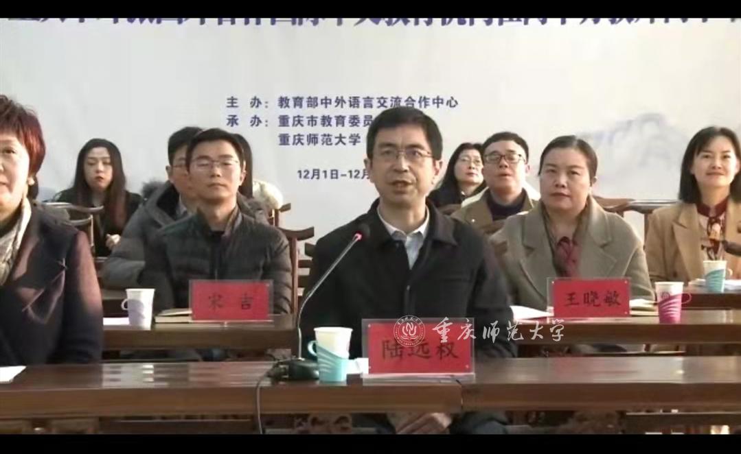 12月1日下午,2021年重庆市外派国外合作国际中文教育机构在岗中方教师岗中培训开班仪式在beat365官网国际汉语文化学院国际会议室顺利举行。此次培训由教育部中外语言交流合作中心主办、重庆市教育委员会及beat365在线体育官网登录入口承办。beat365官网副校长陆远权、重庆市教育委员会国际合作与交流处江燕副处长出席了本次开班仪式,相关工作人员及此次培训的35名学员在“云端”参加仪式。开班仪式由国际汉语文化学院院长张礼慧主持。
