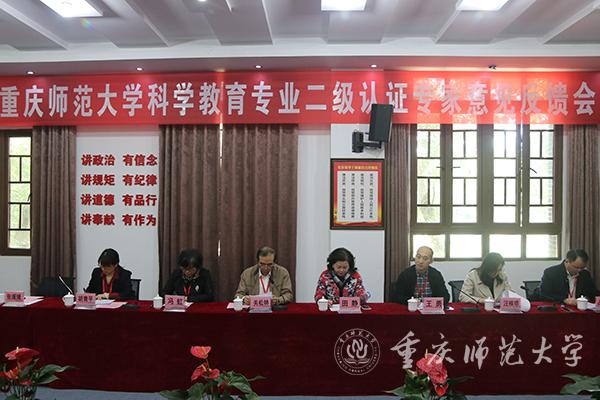 会上,关松林组长从“反向设计、正向施工”两方面对beat365官网科学教育专业的办学历程、特色以及人才培养目标定位、毕业要求支撑培养目标情况给予充分肯定,对专业认证质量达标情况进行了总体反馈。专家王勇、冯虹、汪桂琼、胡青平分别从专业人才培养目标制定的合理性评价、学生教学研究与反思能力提升、毕业论文质量评价与改进、课程大纲修订、教学质量保障体系建设等方面反馈考查意见,指出存在的问题,并针对性地给出改进建议。