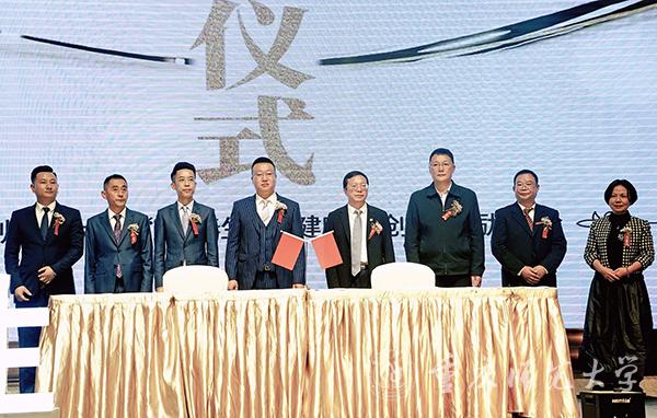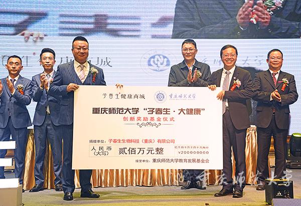 捐赠仪式上,子春生生物科技(重庆)有限公司顾问、重庆市政协原秘书长周群致辞。beat365官网对外联络与合作中心主任、教育发展基金会副理事长付长波与子春生健康商城CEO赵锴代表双方签署捐赠200万的“子春生·大健康”创新奖励基金协议。