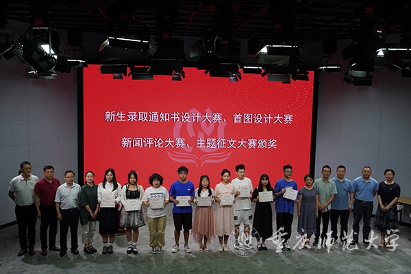 颁奖环节中,获奖学生代表进行节目展示或分享获奖感言。文学院2021级王潞嘉同学模拟主持展示《观物品文》,声音铿锵有力、思维清晰、台风沉稳,让人眼前一亮。新闻与传媒学院2020级郭哲彤、叶丽芳,2021级硕士研究生周桂宇,地理与旅游学院2020级黄代强,共同带来《魂断蓝桥》片段配音展示;他们将人物角色扮演得惟妙惟肖,展现出了重师学子多才多艺、自信活力的风采。马克思主义学院2019级吴芷馨同学分享作品《祖国在我心中》的拍摄构思,用自己的作品展现了时代的光彩。新闻与传媒学院2020级吴睿以信封为载体,将校徽作为封口,印上校风、学风和重师精神,添加了泛月桥、图书馆和东大门剪影以及荷花、银杏等元素,设计了本科新生录取通知书,其简洁大气,充满重师“韵味”。体育与健康科学学院2018级易小琅构思的短视频《文武双全体育人,神采飞扬筑青春》,以个人大学四年的收获与成长为主线,表达出校园的优美环境和所蕴含的体育底蕴,打破人们对体育生的刻板印象,展现出重师体育人的朝气和一代又一代的传承。