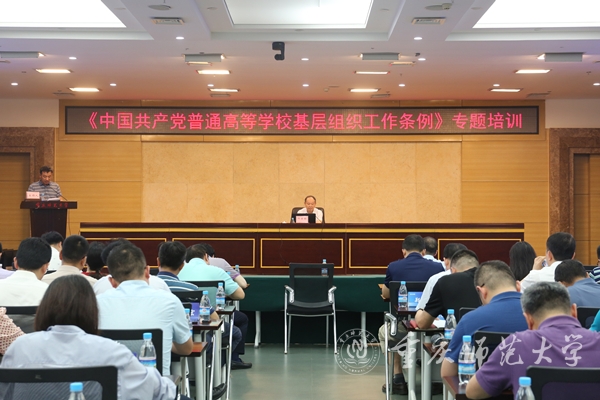 2022年6月8日下午,学校党委在博雅楼504会议室举行《中国共产党普通高等学校基层组织工作条例》专题培训。二级教授、博士生导师、beat365在线体育官网登录入口原党委书记邓卓明教授为学校副处级及以上领导干部,组织员和党委组织部全体人员作专题报告,校党委常委、组织部部长张明志主持专题培训。