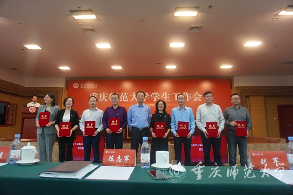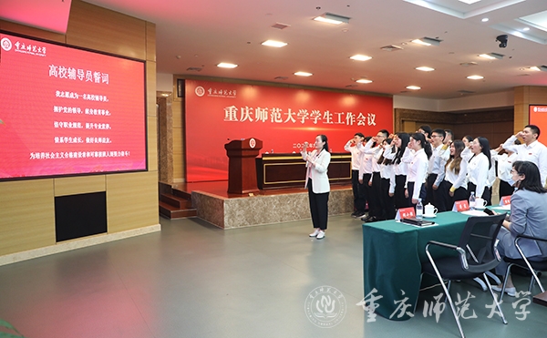 会议伊始,19名新入职辅导员在物理与电子工程学院党委副书记曾艳的带领下,面向“高校辅导员誓词”庄严宣誓。今年,学校从有丰富学生工作经验且在学生处、招就处、团委有过处级领导干部任职经历的干部中遴选了11位老师担任学工队伍建设“青蓝工程”青年辅导员导师。陈志军副书记为辅导员导师们颁发聘书,辅导员代表向导师们送上拜师鲜花表达敬意。