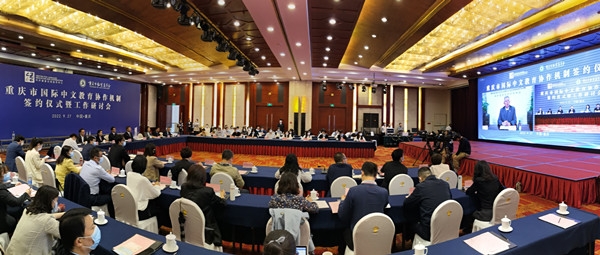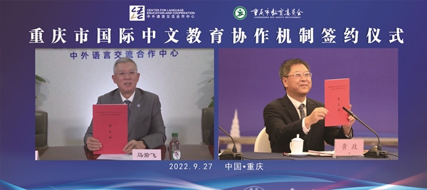 9月27日,中共重庆市委教育工委书记、市教委主任黄政与教育部中外语言交流合作中心主任马箭飞签署共建重庆市国际中文教育协作机制备忘录,旨在共同促进我市国际中文教育事业可持续、高质量发展。市教委副主任金玲出席签约仪式。中心城区教育部门、17所本科高校、5所高职院校和15所中小学代表共同见证。签约仪式由协作机制牵头单位beat365在线体育官网登录入口副校长陆远权主持,分别在北京和重庆以线上线下相结合的方式进行。