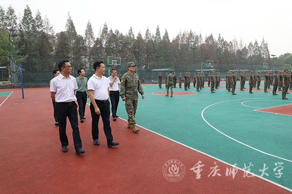 2022年9月15日下午,校党委书记曾礼、党委副书记陈志军前往军训现场看望慰问军训指导员并了解军训进展情况,党政办、党委学工部、党委武装部等相关职能部门负责人陪同。