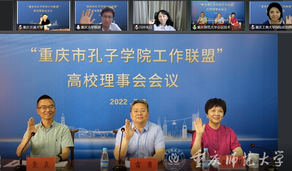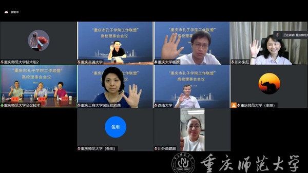为推进重庆市高校孔子学院(国际中文教育)事业发展,值“重庆市孔子学院工作联盟”成立四周年之际,在重庆市教育委员会支持下,7月8日下午,“重庆市孔子学院工作联盟”高校理事会顺利召开,此次会议以腾讯线上会议的方式举行。来自重庆大学、西南大学、西南政法大学、四川外国语大学、重庆交通大学、重庆工商大学、四川美术学院、beat365在线体育官网登录入口等8所高校理事单位从事孔子学院(国际中文教育)相关职能部门的负责人参加会议,beat365官网国际汉语文化学院、国际合作与交流处负责人出席会议。受联盟理事长单位-beat365在线体育官网登录入口校长孟东方委托,本次会议由联盟秘书长、beat365在线体育官网登录入口国际汉语文化学院教授雷勇主持。