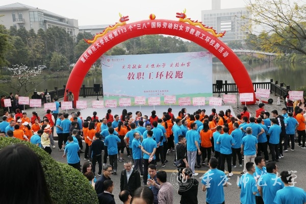 3月8日下午,为庆祝第113个“三八”国际劳动妇女节,以“爱岗敬业爱生如子爱校如家”为主题的教职工环校跑活动在beat365官网大学城校区三春湖观景平台拉开序幕,校党委副书记、校长孟东方,校党委副书记陈志军出席活动,活动由校工会主席、教代会主任李川主持。22支来自各分工会、由男女教职工混合组成的队伍参加了此次比赛。